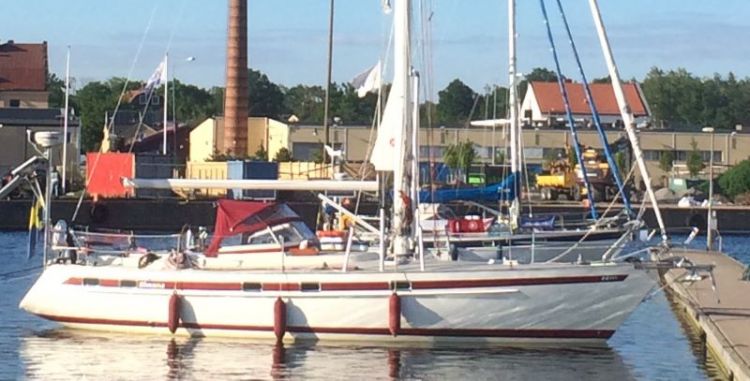 Direkt till babord om nedgångstrappan finns L-format framvänt pentry med spis med ugn och dubbla diskhoar. Pentryt har en lång arbetsbänk som sträcker sig akterut i gången under sittbrunnen. Gången leder till akterruffen (avskiljbar med dörr) som består av garderob, två kojer och sittplats. Till styrbord om nedgångstrappan finns toalett med handfat, separat haddusch och garderob för sjökläder. Toaletten är klädd med vita laminatskott och duschtrall i Corian för att tåla vatten. För om toaletten finns navigationsbord längs styrbordssidan. Utfällbar pall finns i anslutning till navigationsbordet. Salong med L-formad soffa till babord och rak soffa till styrbord. Mellan salong och förpiken finns duschkabin till babord och garderob till styrbord. Klassisk förpik med två kojer. Inredningen är i obetsad afrikansk khayamahogny som är lackad sidenmatt.