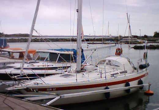 Stickkoj, pentry med dubbla diskhoar och spis med ugn, navigationsbord, salong med två soffor, toalett med handfat, förpik