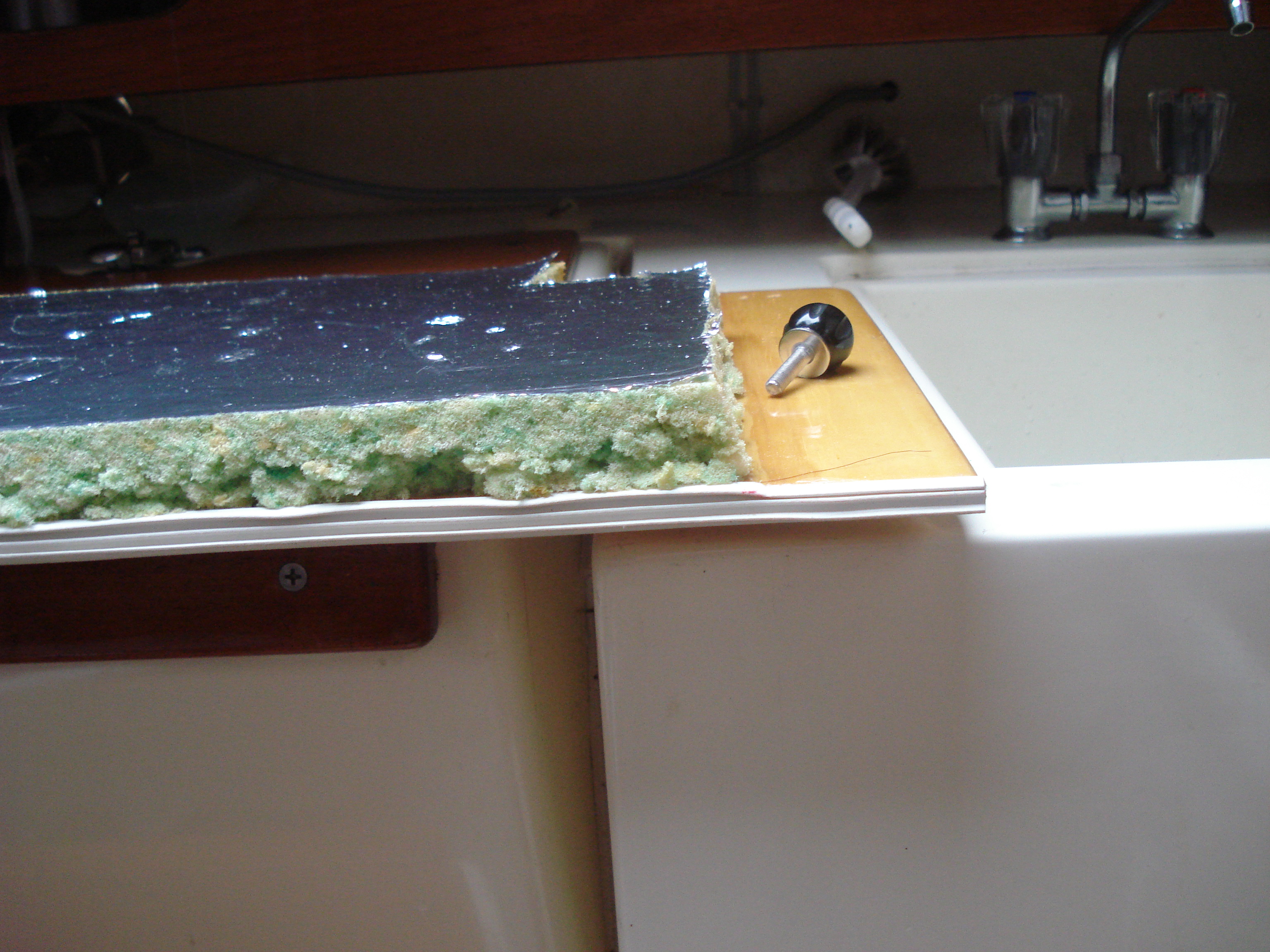 Jag sågade öppningen helt ned till kojens botten, då visade det sig att det blev en öppning mellan botten och återstående delen av motorrumsväggen. Detta måste man ju staga upp. Jag tillverkade då en hörnlist bild 2035, som jag limmade i stuvfacket under kojbotten mot väggen. Skruvarna som höll listen under härdningen fick ju borras för, och dras inifrån motorrummet.