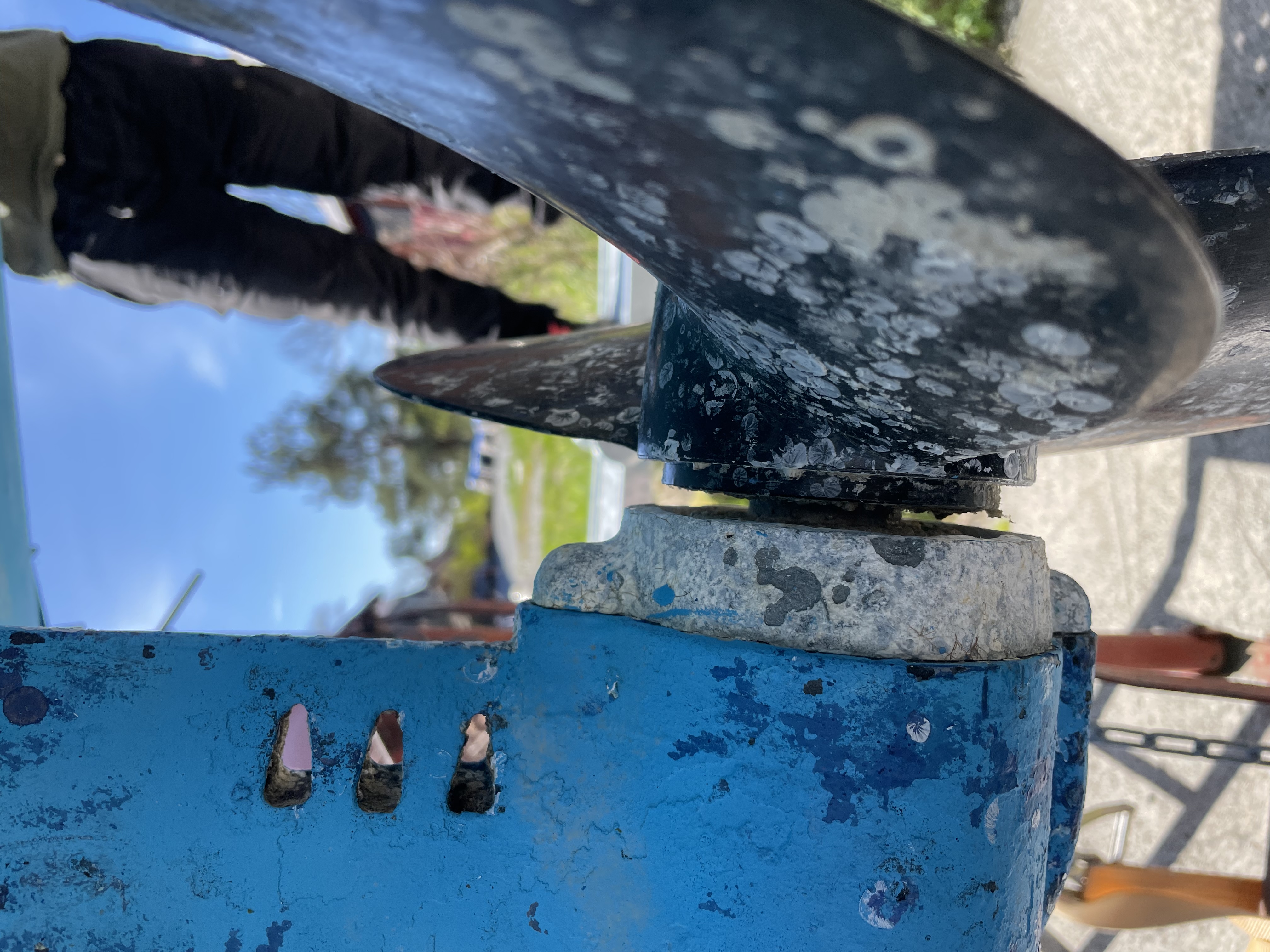 Jag tycker mig se att propellern har ett separat inre nav, kanske med en gummibussning runt. Risken med att belasta propellern med ett fastkorroderat inre nav är väl att den inre delen separerar från propellern och ställer till det rejält..Among Us